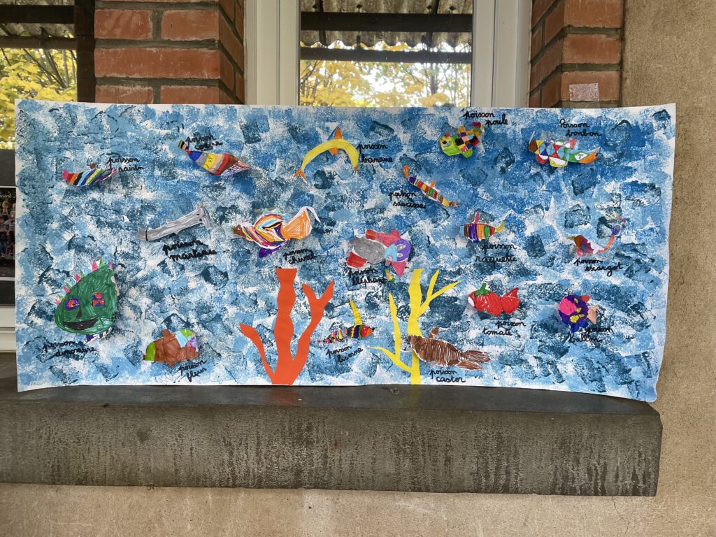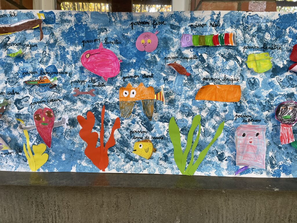 Pour illustrer ce travail, les élèves de la petite section jusqu’au Ce1 ont réalisé une fresque. Les plus jeunes ont préparé le fond afin que les GS, CP et Ce1 y fixent les poissons bizarres sortis de leur imagination. Ils étaient fiers de présenter le résultat de cette sensibilisation à leurs parents à la sortie de l’école. Nul doute que ce poisson-fesse se rappellera à eux dans les situations de moquerie !