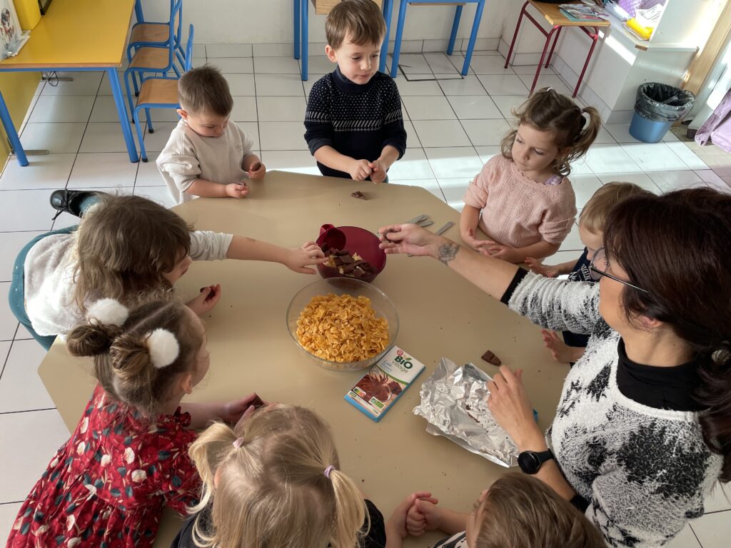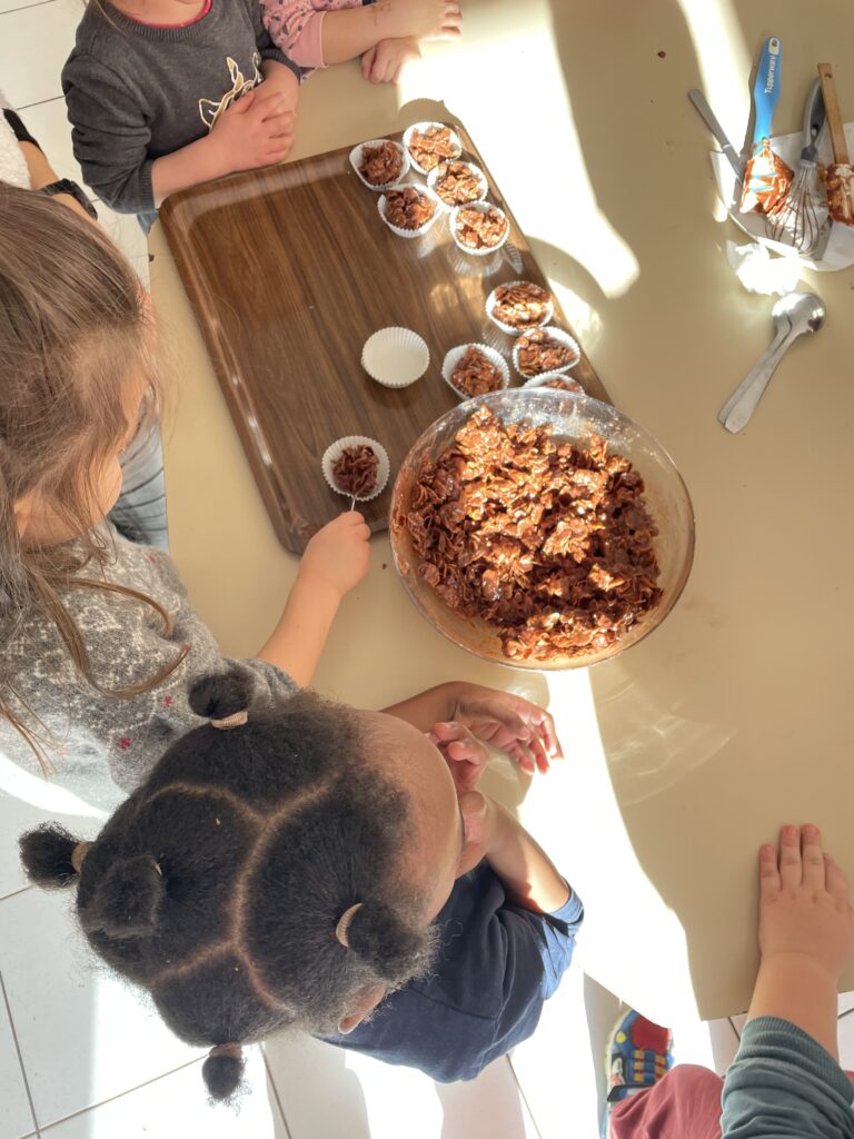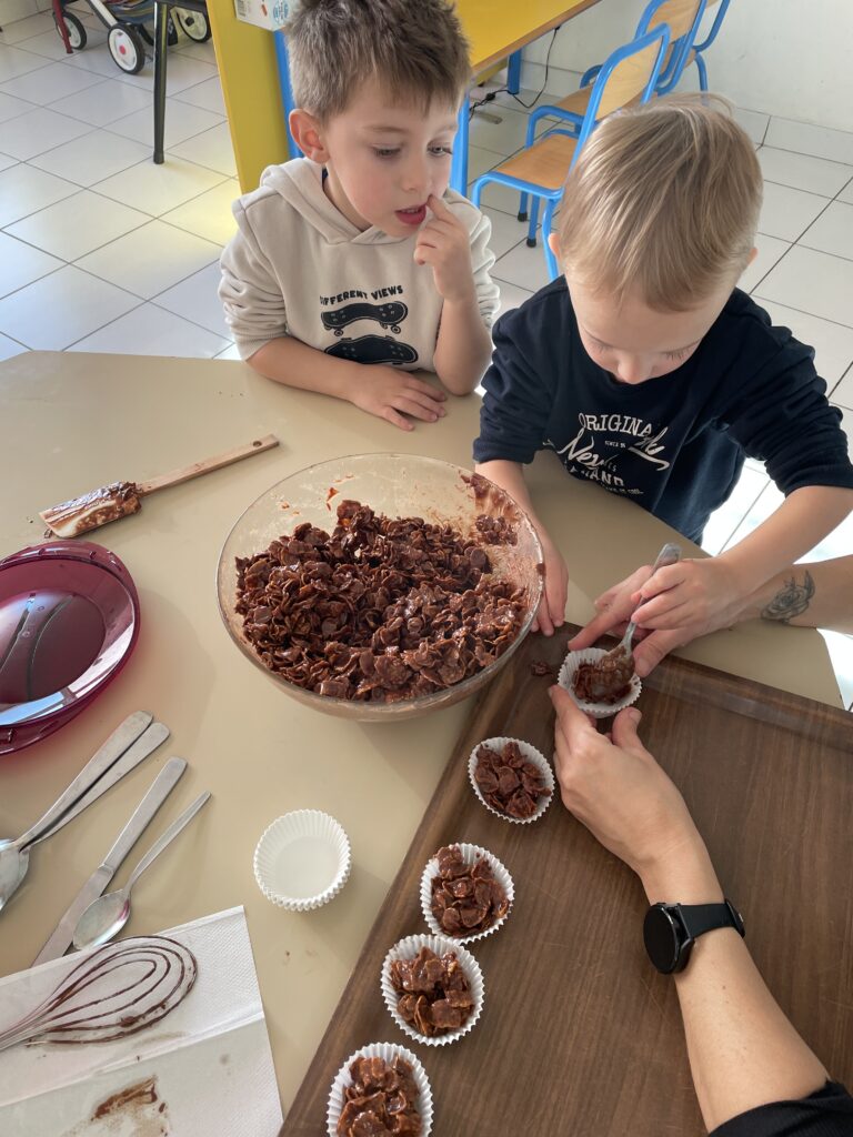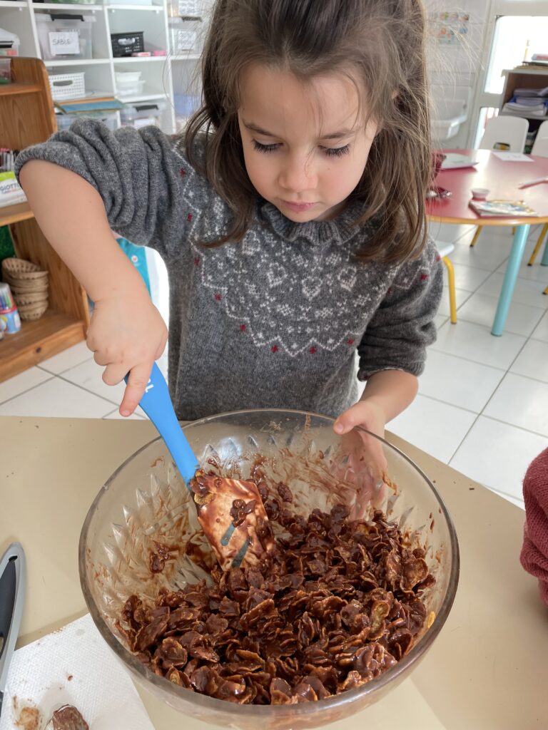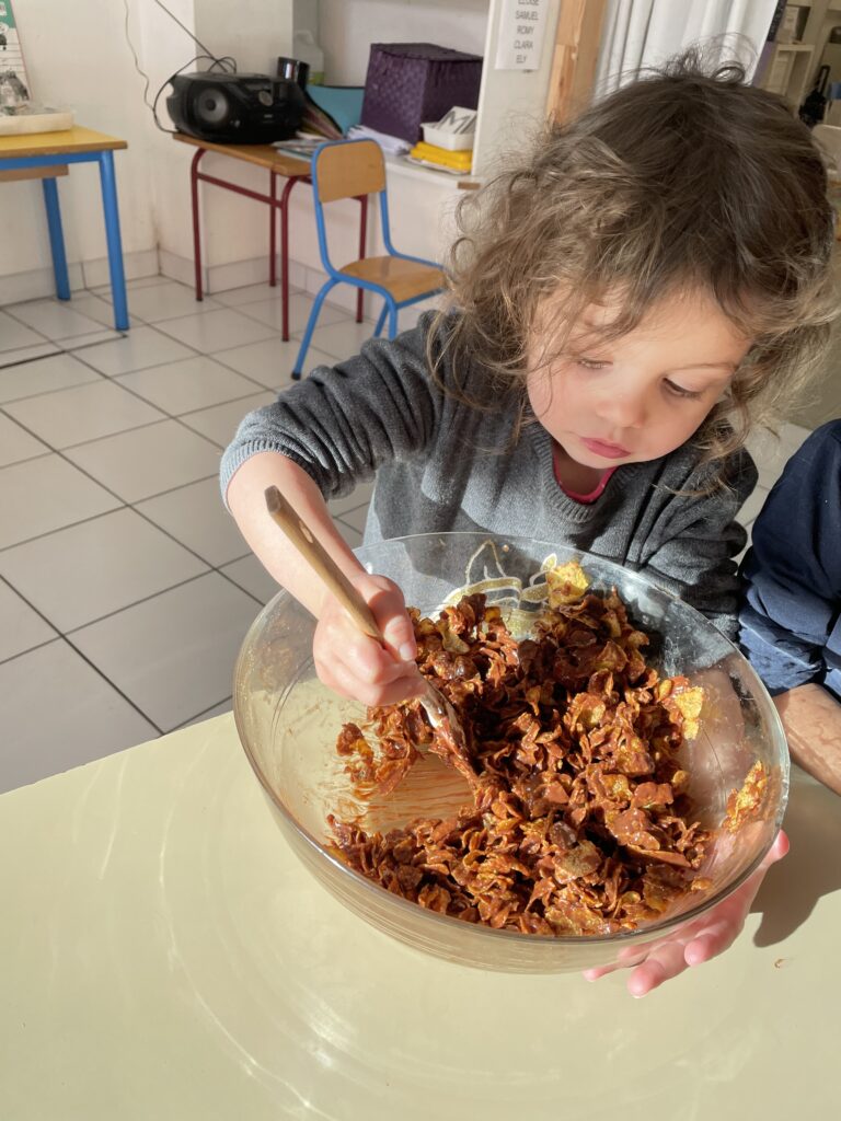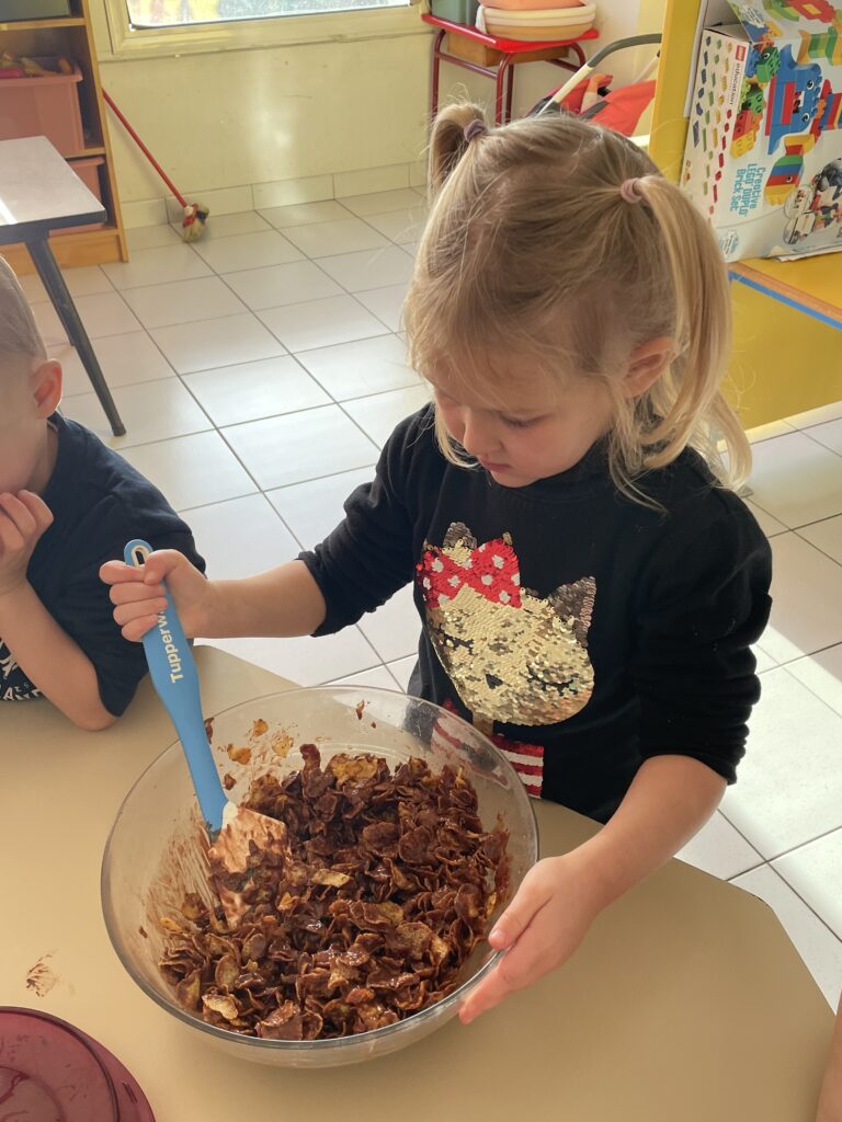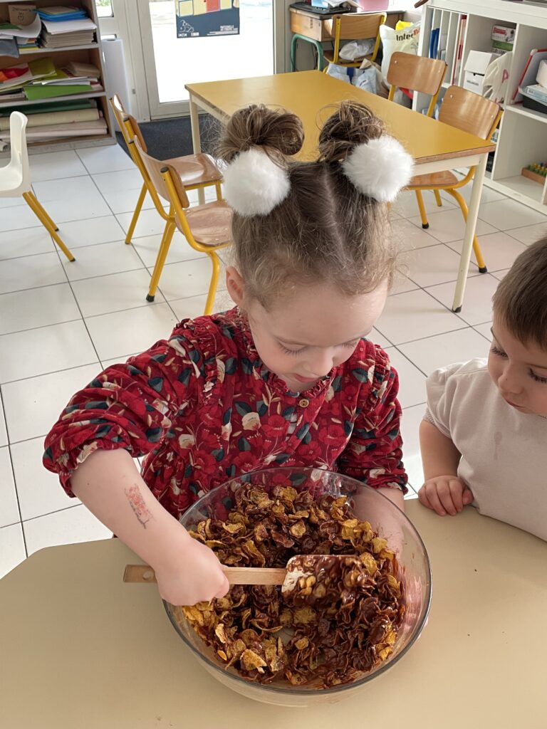 Noël est l’occasion de petits bricolages au service des apprentissages et le choix pour cette année a été de pâtisser. Quoi de plus simple que de réaliser des roses des sables à emporter à la maison ?!