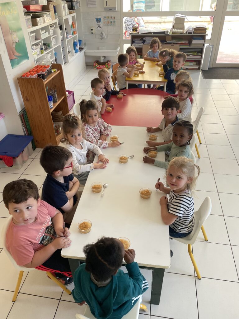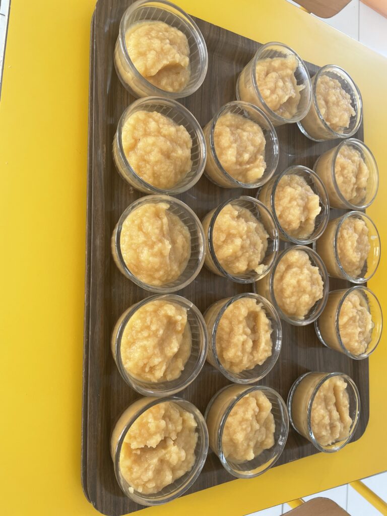 Il a été alors facile de les découper avant de les placer dans une casserole. Avec un peu d’eau, la maîtresse les a faites cuire. Après la sieste, la compote était prête à être dégustée.