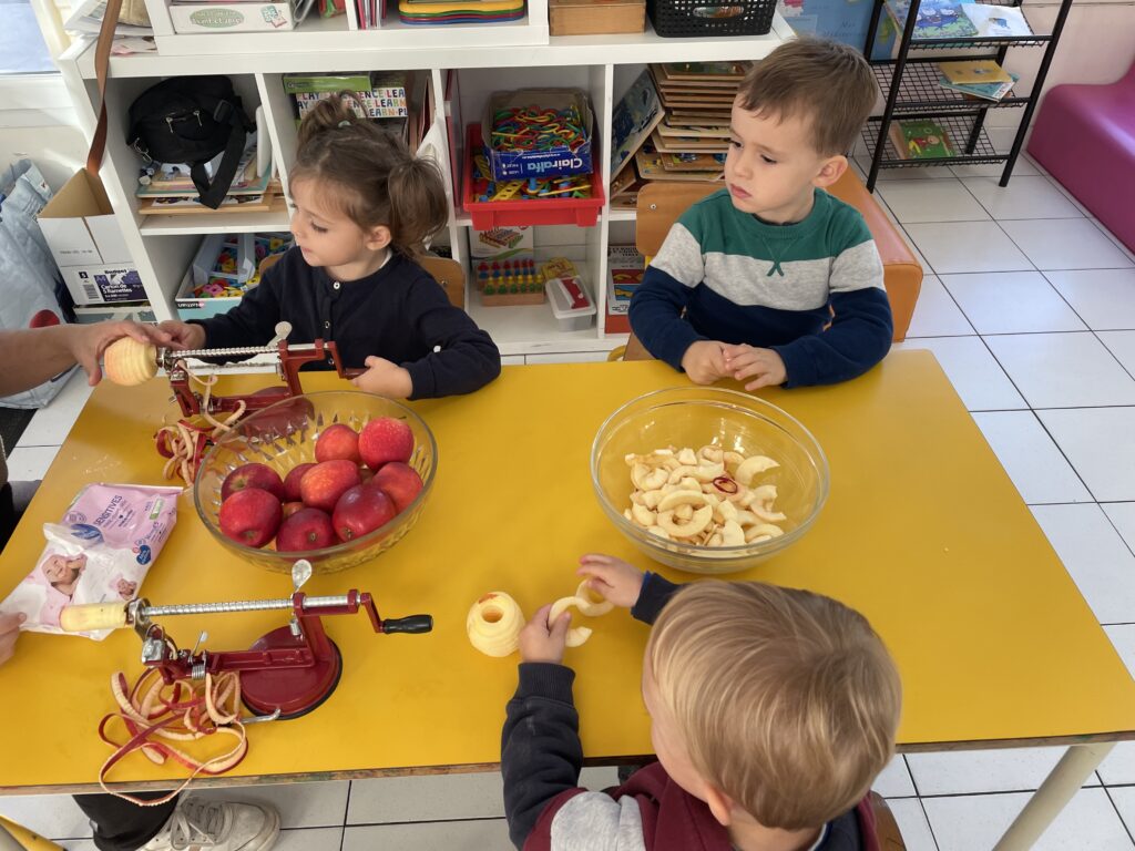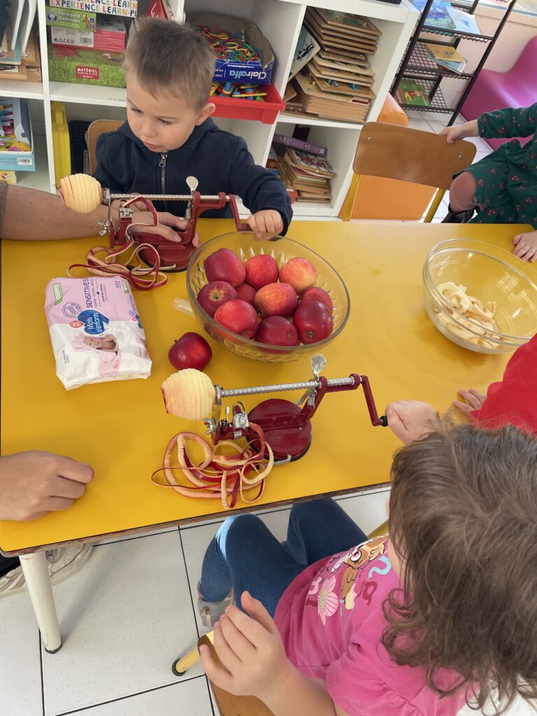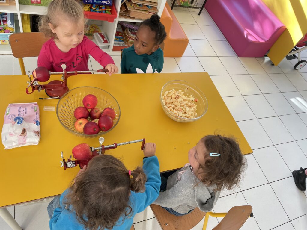 Pour la dernière animation, nous avons réalisé de la compote de pommes. Les enfants ont tout d’abord pelé les pommes à l’aide d’un pèle-pomme.