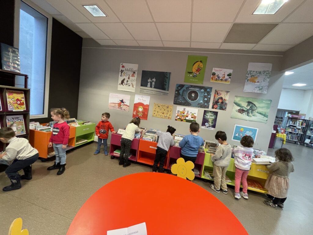 Grâce à un partenariat avec la médiathèque de Réalmont, les élèves de maternelle peuvent s’y rendre trois fois par an. A chaque visite, les enfants profitent d’activités variées autour des livres.